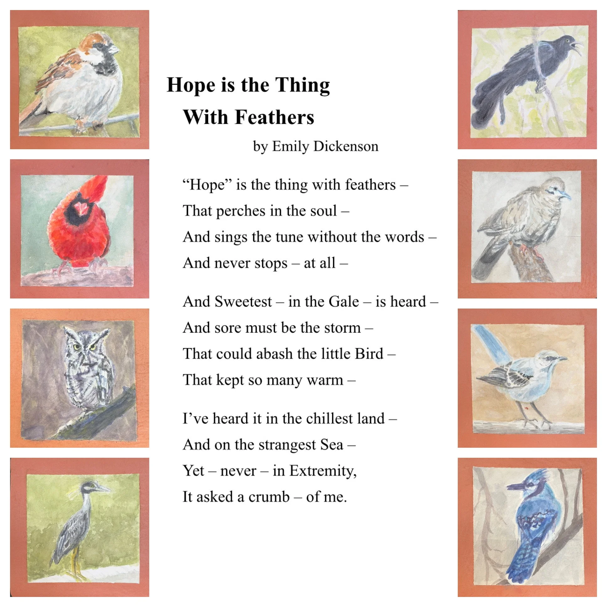 We are living in challenging times. Emily Dickenson’s poem, “Hope is the Thing With Feathers”, is what inspired me for the Annual “Pretty Darn Small Art Show” at Hardy and Nance Studios. Hope is the resilient and enduring force that helps us ‘hang in there’ while we work through difficulties.